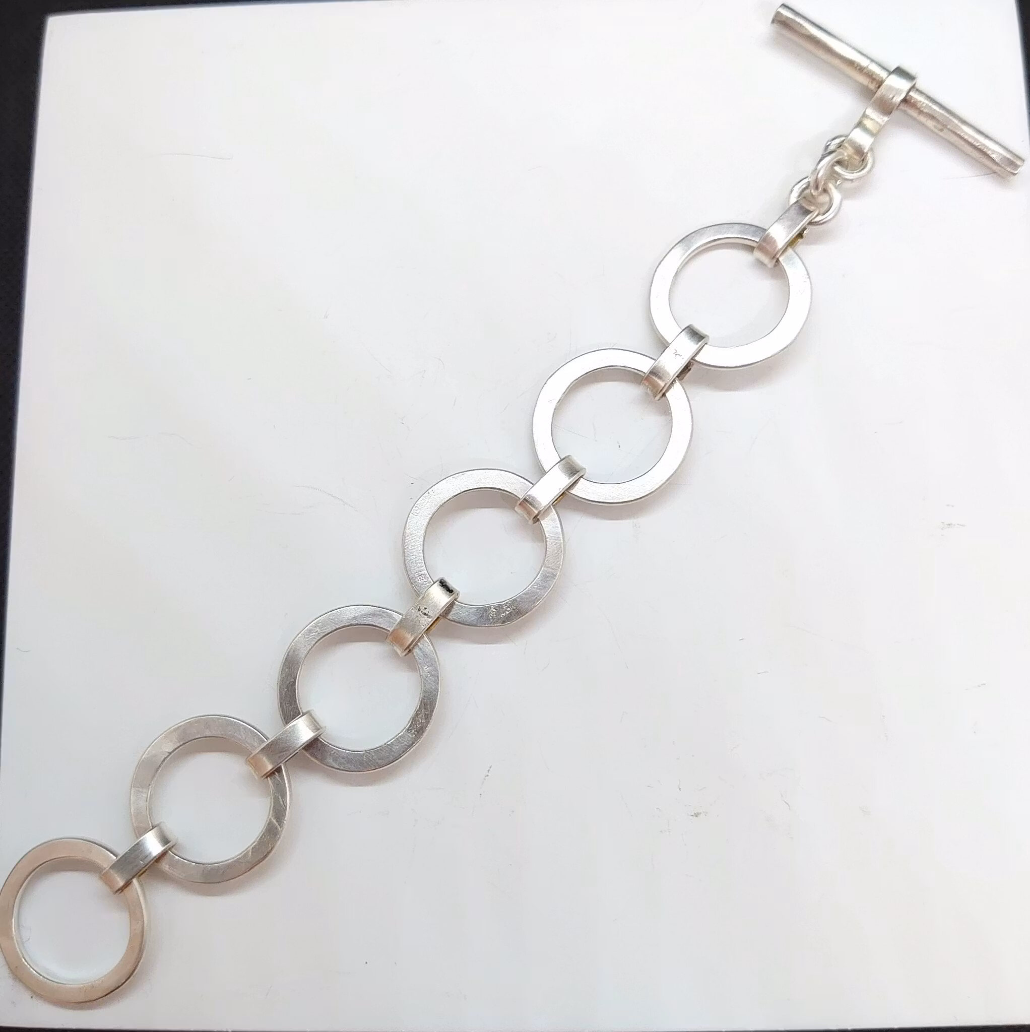 Handgjort armband i äkta silver av hamrade ringar, ca 18 mm i diameter, höjd ca 1,5 mm. Mellandelarna är 3 mm breda och 1 mm höga. Namnet 'Perfectly imperfect' fick armbandet för att vi inte ville ha ett perfekt slipat och polerat intryck, istället är armbandet perfekt med alla sina fel och brister, precis som vi. Ett armband med den här typen av lås blir något längre för att man ska kunna trä staven genom ringen. Mät din handled så lägger vi till rörelsemån.